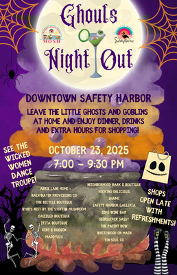 Leave the little ghosts and goblins at home and enjoy some festive fun shopping, eating and having fun in Downtown Safety Harbor! The Wicked Women Dance Troupe will be dancing along Main Street for donations to a local charity. Many Boutiques will be open later this evening, until 9:30pm.