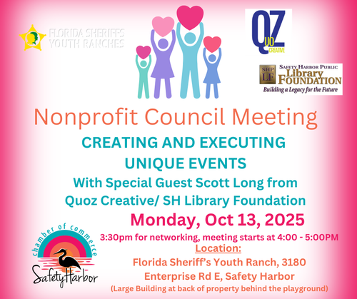 Join us for our next Nonprofit Council meeting featuring Scott Long of Quoz Creative and the Safety Harbor Library Foundation. Scott has been behind some of the most fun and impactful events in our community, and he’ll be sharing his expertise on how to design events that play to your organization’s unique strengths.