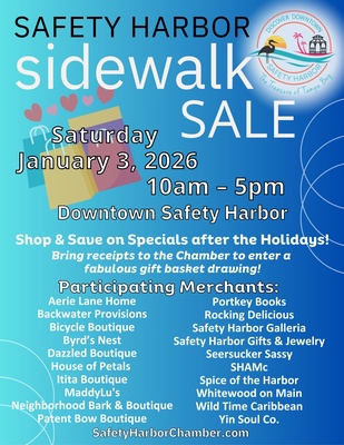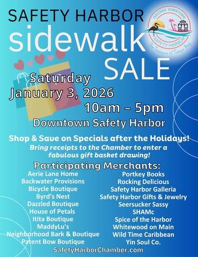 Saturday, January 3rd - Join us for a fabulous sidewalk sale in downtown Safety Harbor! Shop local, support our amazing businesses and expect to see lots of steals and deals. Bring your friends and plan to shop 'til you drop. Make it a great dining experience too!